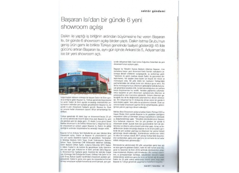 Başaran Isı, Daikin ile gerçekleştirdiği iş birliğinin ardından büyüme çalışmalarına hız kesmeden devam ederek bir günde 6 yeni showroom açılışını hayata geçirmiştir. Türkiye genelinde hizmet ağını genişletme hedefi doğrultusunda Ankara’da 5, Adıyaman’da ise 1 yeni showroom faaliyete alınmıştır. Açılan yeni satış noktaları ile birlikte firma, müşterilerine daha hızlı, erişilebilir ve kaliteli hizmet sunmayı amaçlamaktadır.